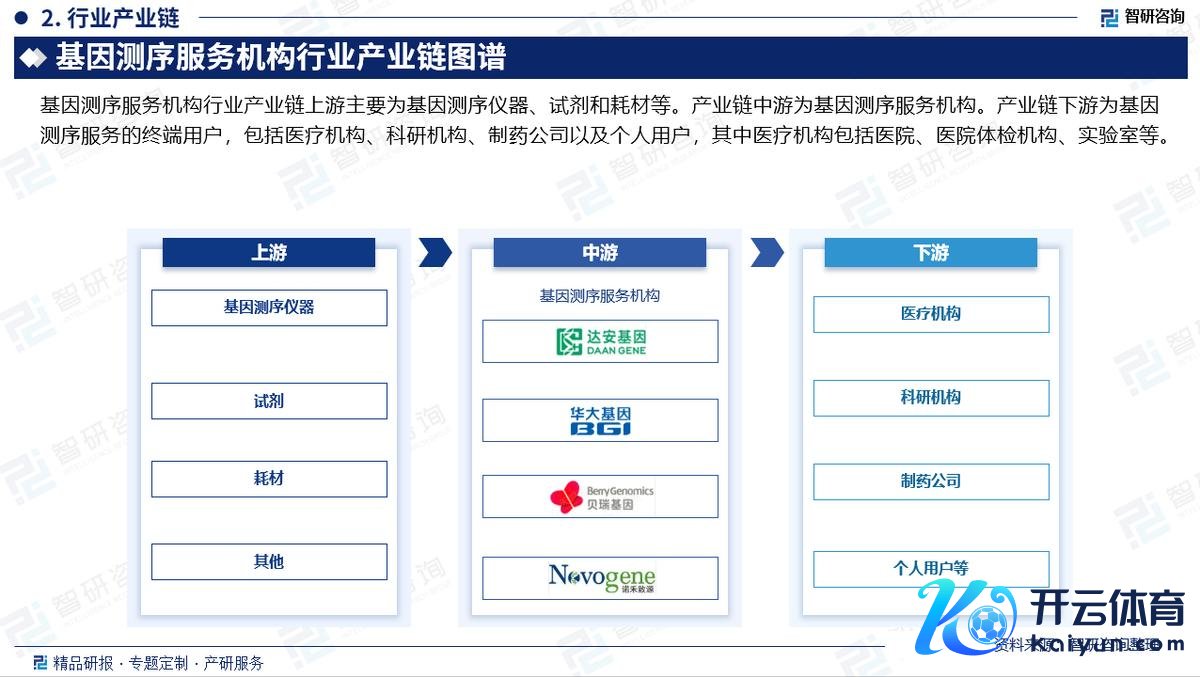 基因测序工作机构行业产业链上游主要为基因测序仪器、试剂和耗材等。产业链中游为基因测序工作机构。产业链下贱为基因测序工作的结尾用户,包括医疗机构、科研机构、制药公司以及个东说念主用户,其中医疗机构包括病院、病院体检机构、实验室等。