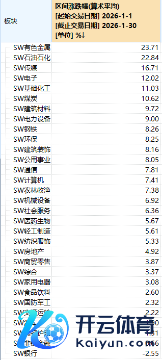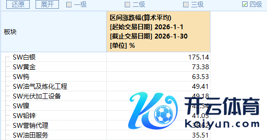 Wind数据显露,申万一级行业中,有色金属1月涨幅最高,跳跃23%。此外,申万四级行业显露,白银当月涨幅超175%,黄金涨幅超73%。