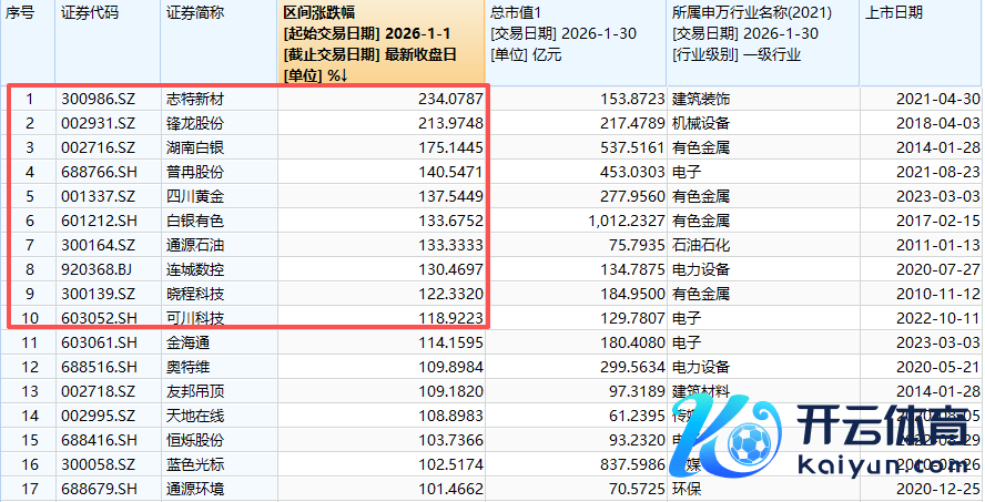 1月十大牛股辞别为志特新材、锋龙股份、湖南白银、普冉股份、四川黄金、白银有色、通源石油、连城数控、晓程科技、可川科技,当月累计涨幅均跳跃110%。